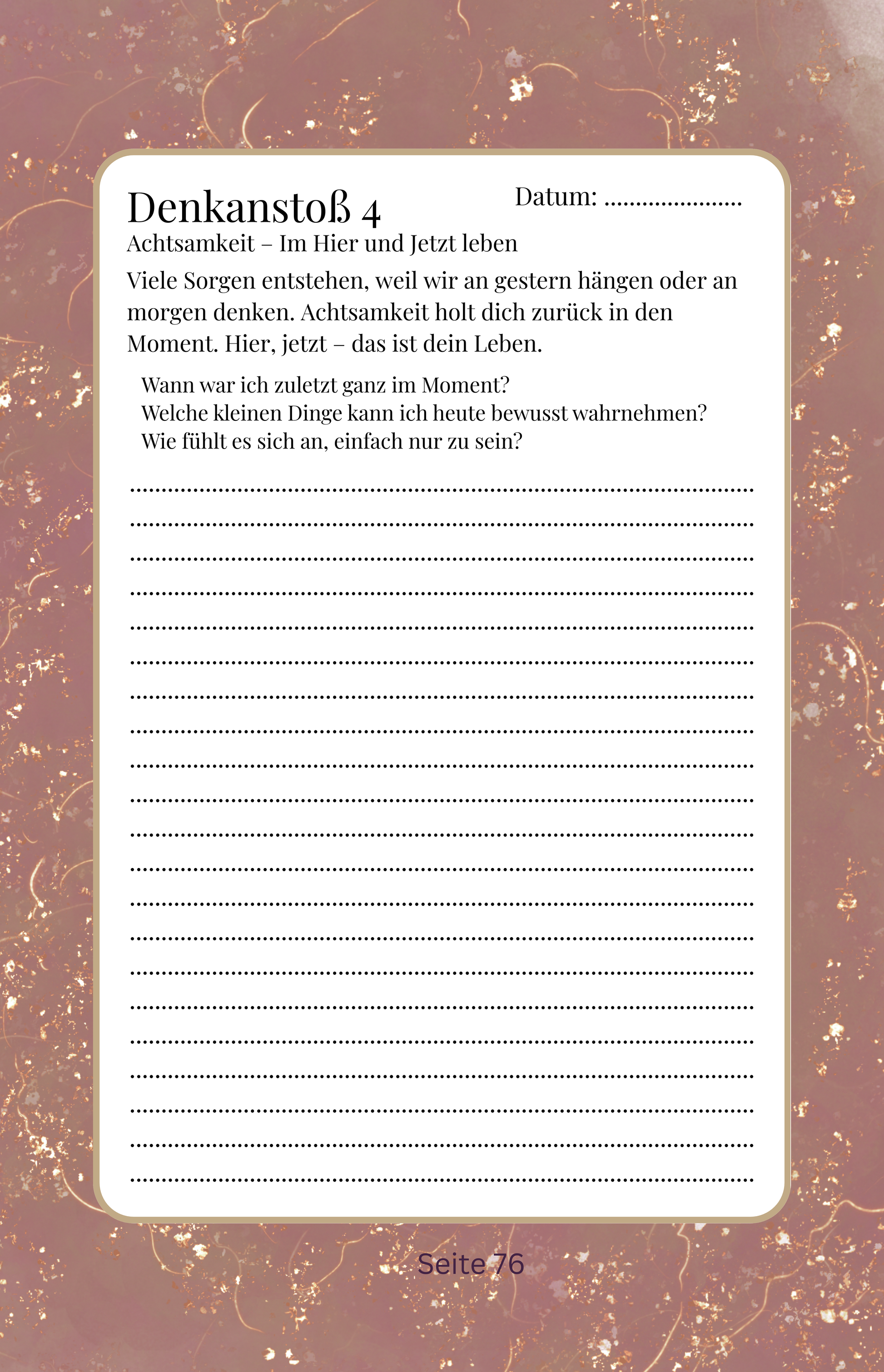 Du bestimmst das Tempo â ohne Druck, ohne Zwang. Dieses Journal ist kein Ersatz fĂŒr therapeutische UnterstĂŒtzung und nicht fĂŒr die Behandlung psychischer Probleme gedacht, sondern als liebevolle ErgĂ€nzung fĂŒr deinen Alltag.